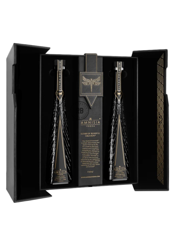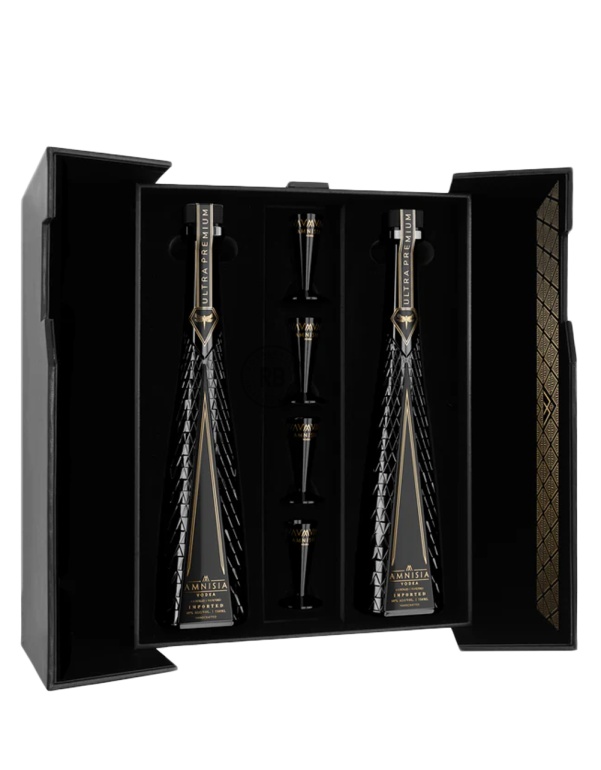 This exclusive, limited-quantity gift box includes two Amnisia Vodka 750ml bottles and four shot glasses. Available on Royal Batch