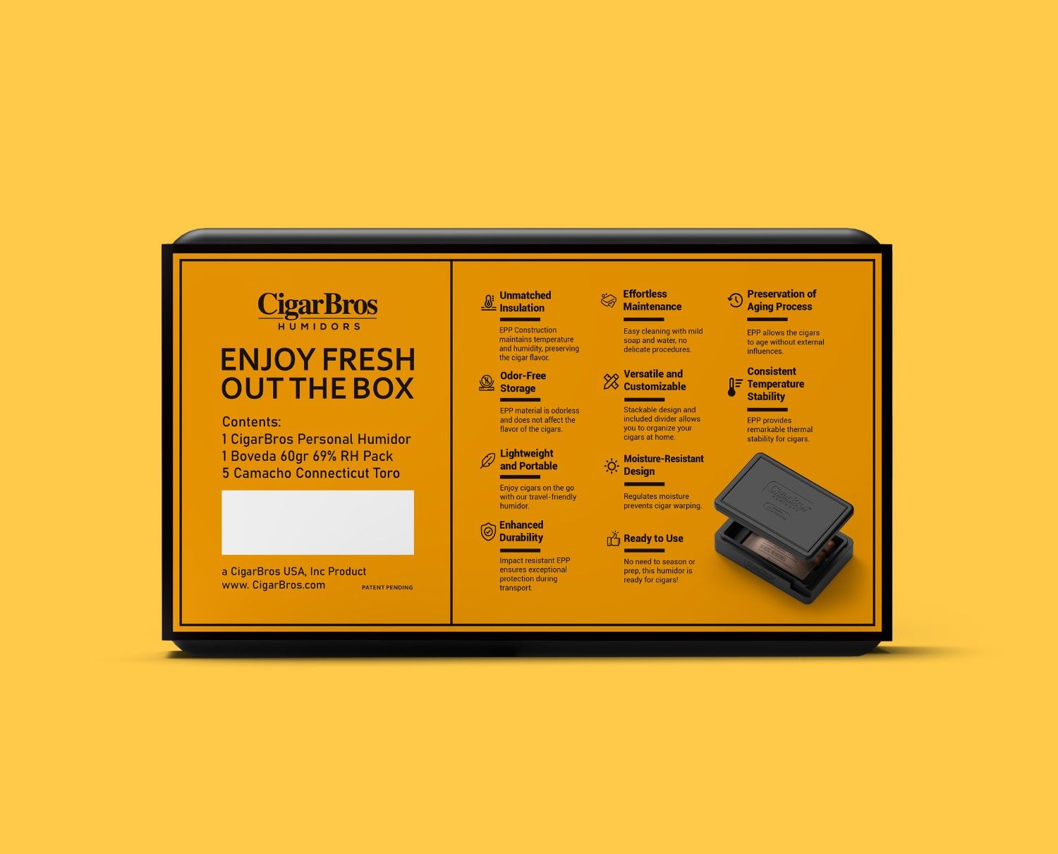 The set includes a personal humidor with a Boveda pack, maintaining optimal humidity levels for up to a year. Simply replace the pack as needed to keep your cigars fresh and flavorful.