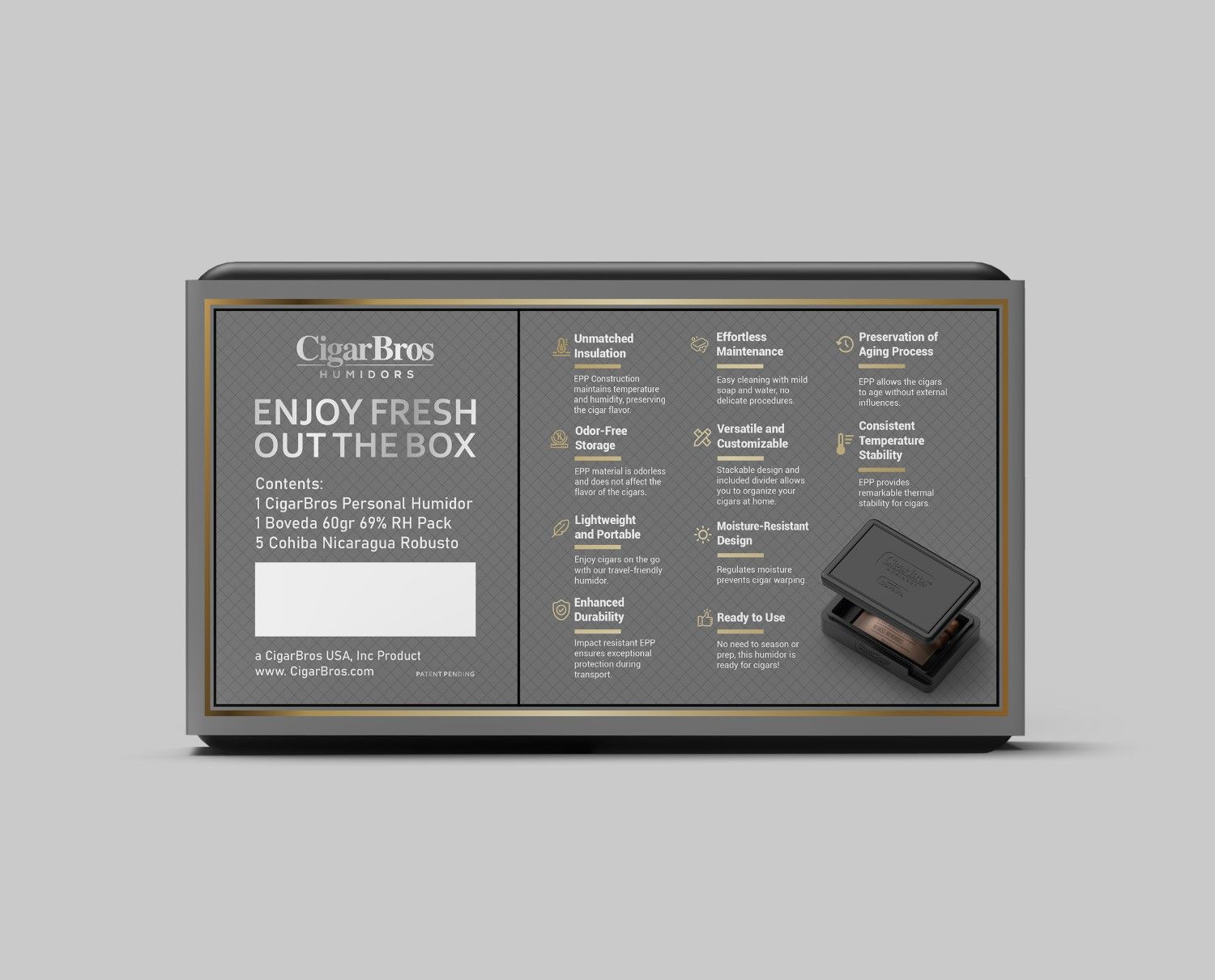 This set includes a personal humidor with a Boveda pack, maintaining perfect humidity and preserving the cigars’ flavor for up to one year. Simply replace the pack to continue enjoying fresh, premium cigars.