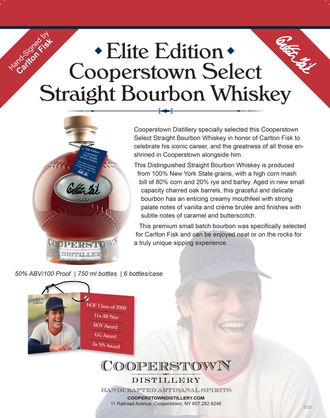 This limited Elite Edition of Cooperstown Select Straight Bourbon Whiskey honors the legendary Carlton Fisk and the storied achievements of all who share enshrinement in Cooperstown. Personally hand-signed by Fisk, this distinguished bourbon is crafted from 100% New York State grain, showcasing a high-corn mash bill that reflects both tradition and finesse.