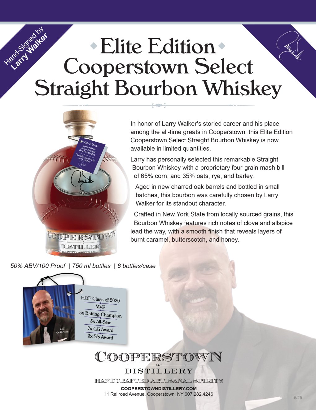 Celebrating Larry Walker’s legendary career and his place among baseball’s all-time greats in Cooperstown, this Elite Edition of Cooperstown Select Straight Bourbon Whiskey is a limited release personally endorsed and hand-signed by Walker. Crafted with a proprietary four-grain mash bill and aged to perfection, this bourbon embodies both character and craftsmanship.