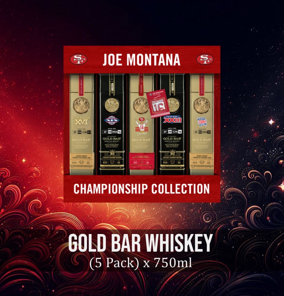 The Gold Bar Whiskey Joe Montana Championship Collection is a one-of-a-kind collector's set that pays tribute to the legendary quarterback Joe Montana and his iconic Super Bowl victories. This set includes five 375ml bottles, each representing excellence in whiskey craftsmanship and celebrating Montana’s historic achievements.
