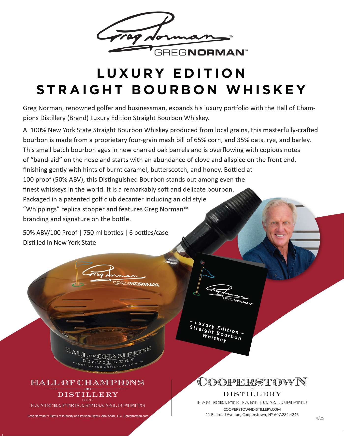 Crafted with the same dedication, legacy, and refined style that define Greg Norman himself, this Luxury Edition Straight Bourbon Whiskey is a signature expression of excellence. Produced in small batches by the Hall of Champions Distillery in Cooperstown, New York, this standout spirit is a bold testament to quality, tradition, and modern luxury.
