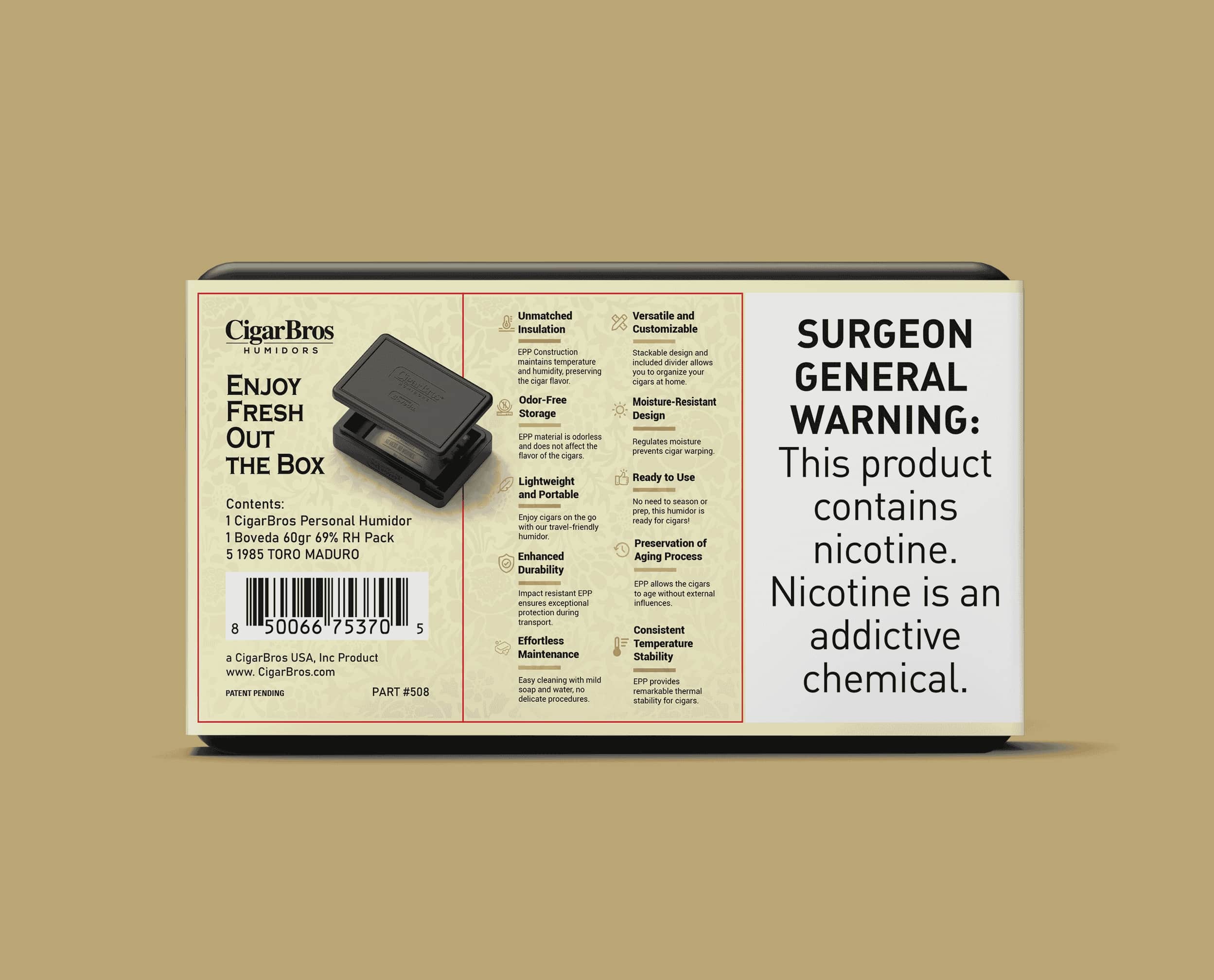 This set includes a personal humidor equipped with a Boveda pack, maintaining optimal humidity to preserve flavor for up to a year. Replace the pack as needed to ensure continued freshness.
