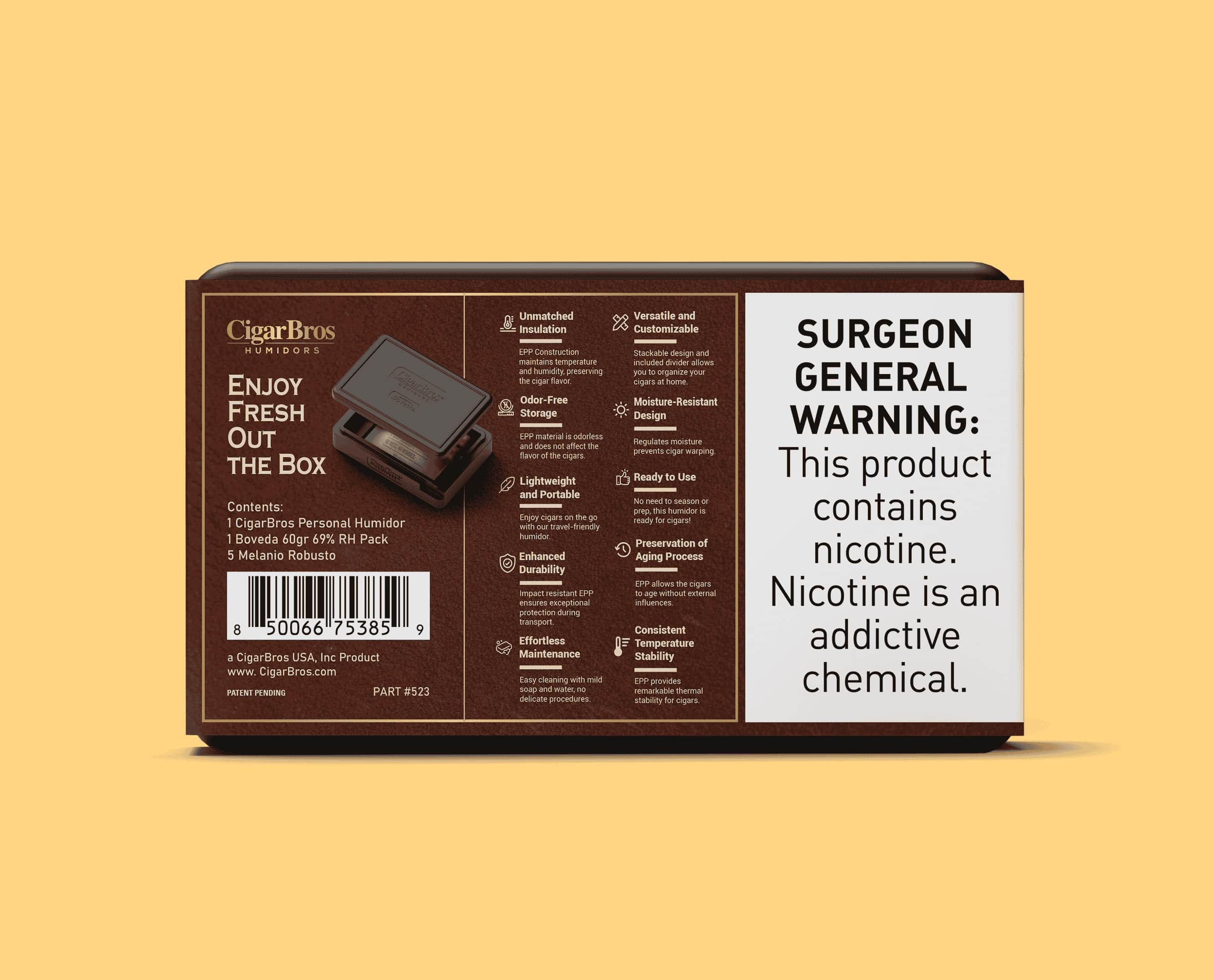This set comes with a personal humidor featuring a Boveda pack, keeping your cigars at ideal humidity for up to a year. Replace the pack as needed to maintain optimal freshness.