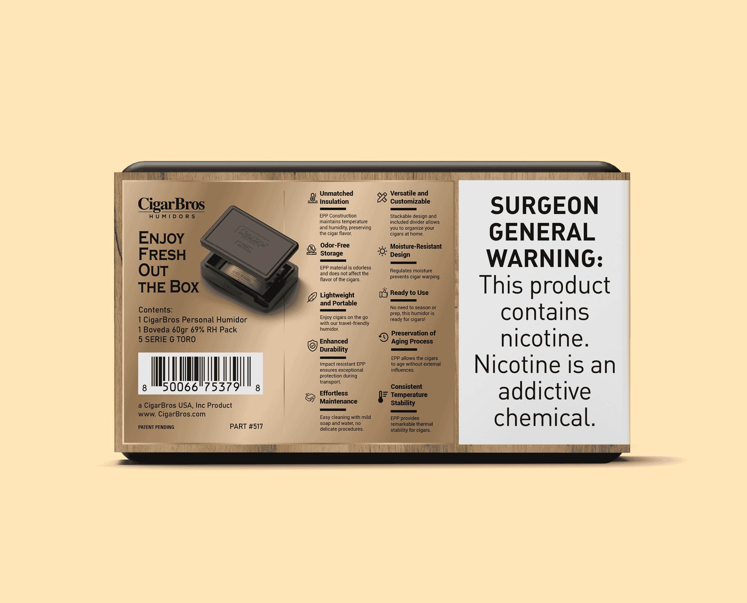 Each set includes a personal humidor with a Boveda pack, maintaining ideal humidity and preserving the cigars’ flavor for up to a year. Replace the pack as needed to continue enjoying fresh, premium cigars.